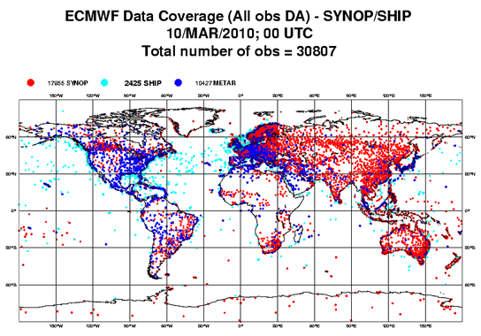 Az ECMWF modellben felhasznált bemenő adatokat szolgáltató állomások eloszlása a Földön