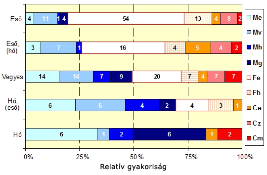 Hirsch Tamás a téli nagy csapadékokkal foglalkozott doktori értekezésében. A 3. ábrán a halmazállapotok relatív gyakorisága látható, az általa alkotott szinoptikus típusok függvényében.