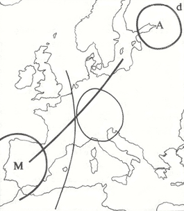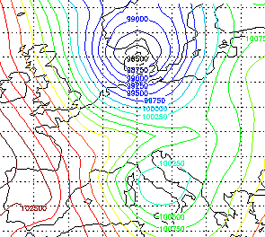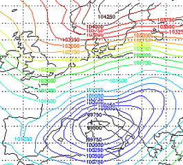 A Bodolainé-féle típusok alapelemeinek (az 500 hPa-os szint teknő-vonala és a ciklon centrum) karakterisztikus helyzetei: