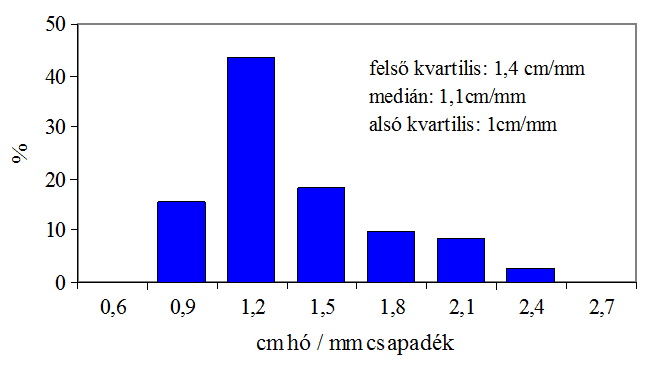 a lehullott hó és a hó vízegyenértéke arányának gyakoriság eloszlása (jobb oldalon)