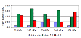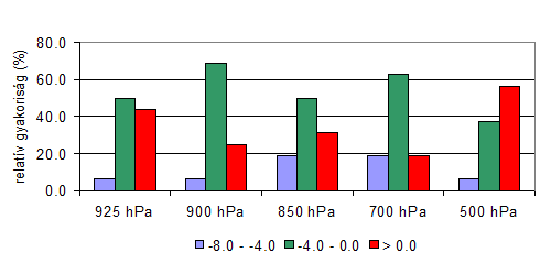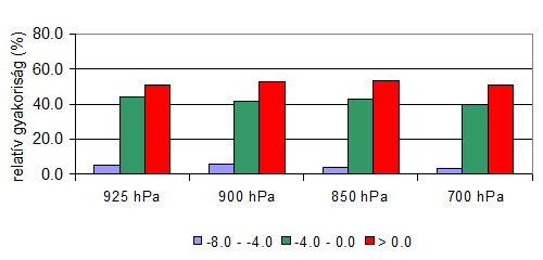 A lokális hőmérsékleti advekció relatív gyakorisága feloszláskor (bal oldalon) és az összes esetben (jobb oldalon)
