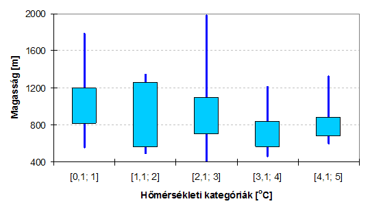 A pozitív hőmérsékleti tartománnyal rendelkező felszállások egyes hőmérséklet kategóriáiban mért inverziós könyökmagasságok eloszlása