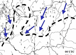 A 850 és 1000 hPa-os szintek közti 1300 méteres rétegvastagság többnyire jól elválasztja a folyékony és a szilárd csapadékot