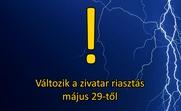2019. május 29-től változik a heves zivatar riasztás és figyelmeztetés kritériuma. Az új szemléletben már a legegyszerűbb zivatar, azaz dörgés, villámlás esetén is figyelmeztetés, illetve riasztás kerül kiadásra, hiszen már egy darab villám is veszélyt jelenthet az élet- és vagyonbiztonságra, nemcsak a hevesebb zivatarokat kísérő viharos szél, valamint jégeső. |